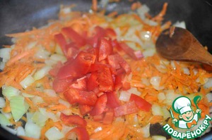 Добавляем нарезанный кубиками красный болгарский перец, обжариваем минуту.