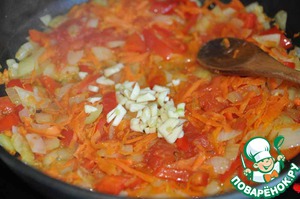 Добавляем к овощам мелкопорезанный чеснок. Всё перемешиваем.
