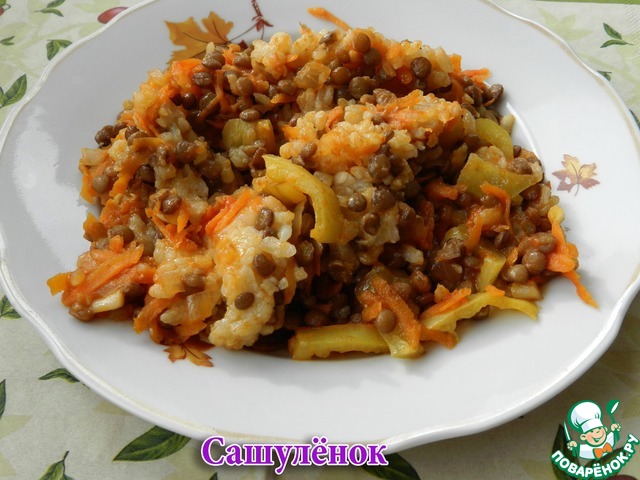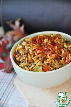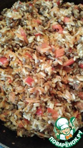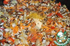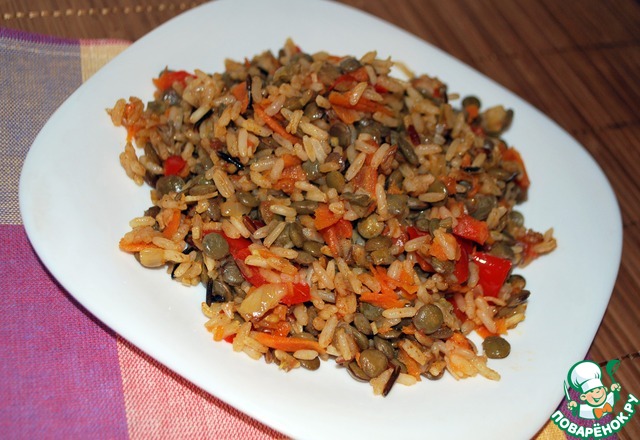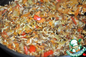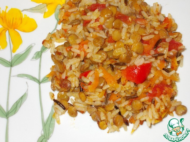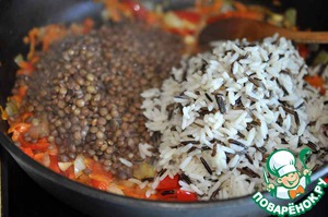 Добавляем к овощам сваренные до полуготовности рис (смесь пропаренного и дикого риса) и чечевицу.