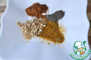 Приготавливаем специи: чёрный молотый перец, красный жгучий перец, карри и сухой имбирь.