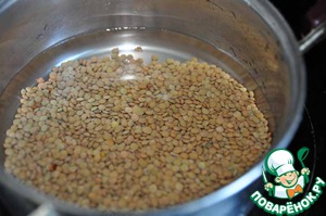 Для муджадары лучше брать зелёную чечевицу, она лучше всего сочетаема с рисом. Чечевицу промываем, заливаем водою в соотношении 1 к 2, доводим до кипения и варим на медленном огне при закрытой крышке 15 минут.