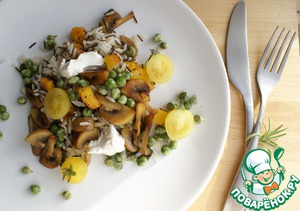 Соединим все ингредиенты: дикий рис, запеченную тыкву, грибы, горошек, помидоры черри, мягкий белый сыр.