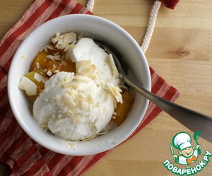 Поверх сладкой запеченной тыквы выложим пару шариков мороженого, присыплем крупной кокосовой стружкой.