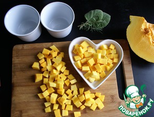 Спелую тыкву очистим от кожуры и семян, нарежем кубиками.