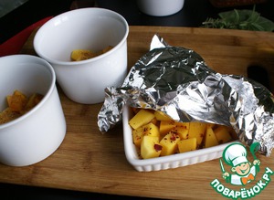 Тыкву для салата сбрызнем оливковым маслом, присыплем солью и красным острым перцем.