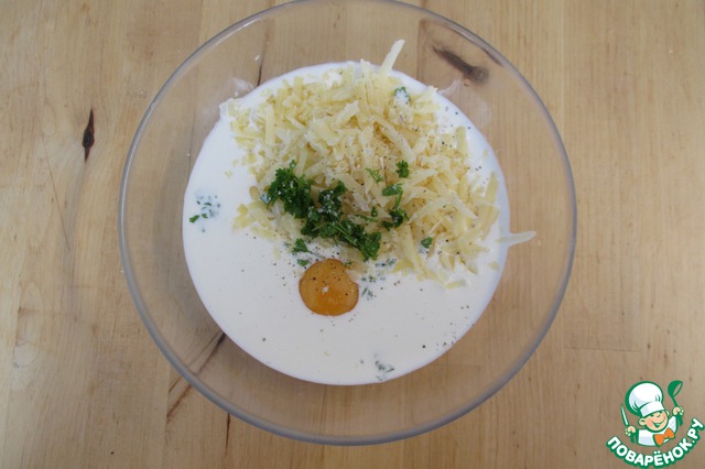 Тем временем смешать 100 мл молока, 100 мл сливок, 30 г тертого сыра, 2 яйца, немного рубленной петрушки. Посолить и поперчить по вкусу.