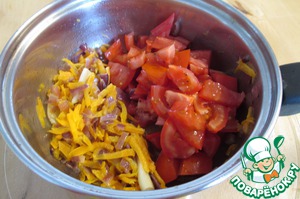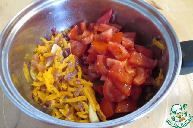 Добавить помидоры, нарезанные кубиками. Обжарить до готовности.