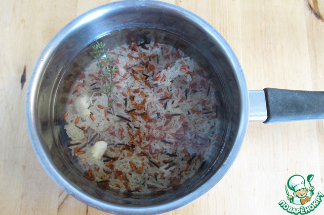 Рис (250 г) отварить в кипящей воде 10 минут, добавив щепотку соли, тимьян (0,5 ч. л), 1 зубок чеснока, очищенного и раздавленного боковой стороной ножа.