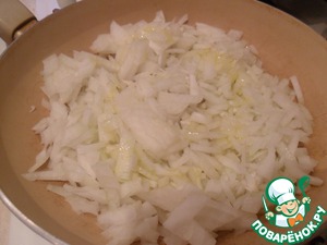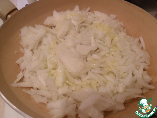 Займемся луком - его необходимо измельчить и выложить жариться в сковороду с растительным маслом (я взяла масло оливковое, у него интенсивный вкус, но можно взять любое другое). Зажариваем лук до карамельного цвета (можно добавить 1/2 ч. л. сахара - цвет будет более приятный). -