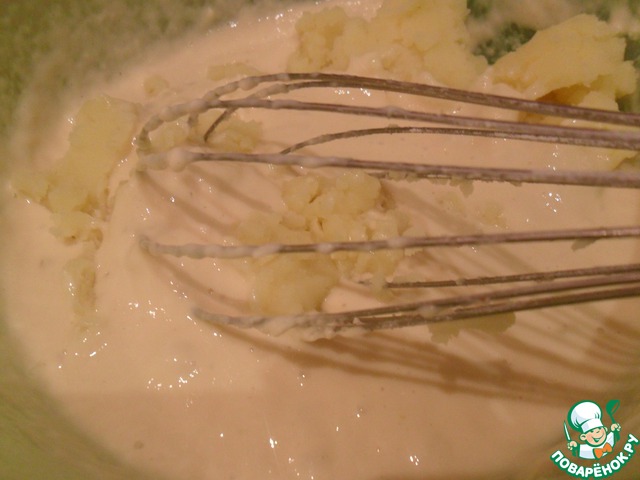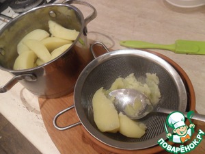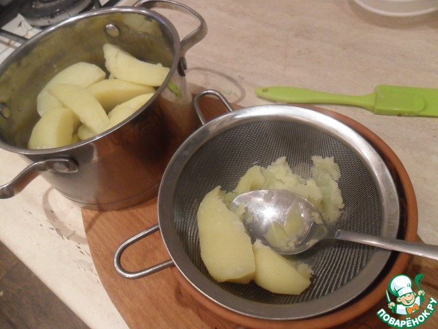 Пока опара "зреет", сварится картофель - вилка должна легко протыкать картофельные кусочки. Слейте всю жидкость и перетрите картофель через сито. Можно провернуть и через мясорубку, или блендером пюрировать, но самый надежный вариант - сито! Комочков не будет 100%!