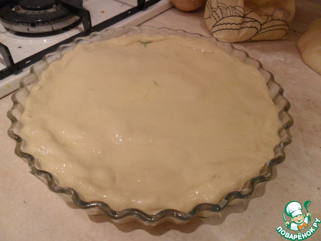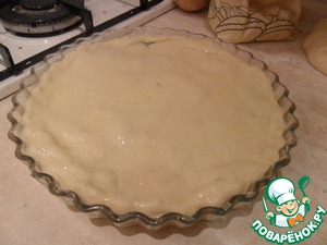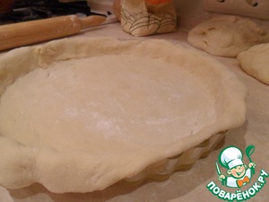 Берем одну часть теста и разрезаем ее на 2 половинки. Из первой половинки раскатываем пласт толщиной приблизительно 4-5 мм, укладываем его в форму, чтобы свисали края - как на фото.