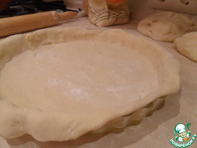 Как видите - края слегка выступают - оба слоя нужно защипнуть пальчиками, а затем обрезать излишки теста прямо по краю формы скалкой. Можно вообще не пользоваться формой - а когда выложите начинку и накроете вторым слоем теста - просто подвернуть и защипнуть по краю пирог. -