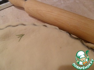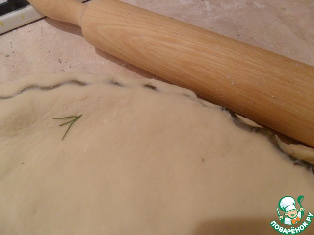 На тесто выкладываем половину начинки, хорошенько разровняв ее по всей поверхности, раскатываем еще кусочек теста (вторую половинку) и и закрываем пирог верхним слоем.