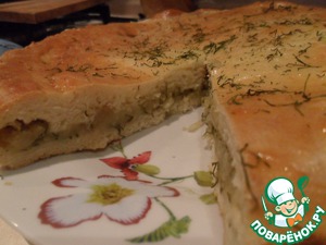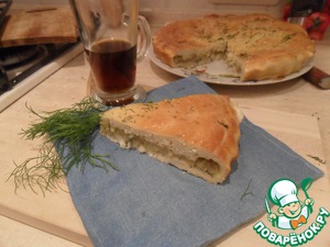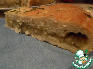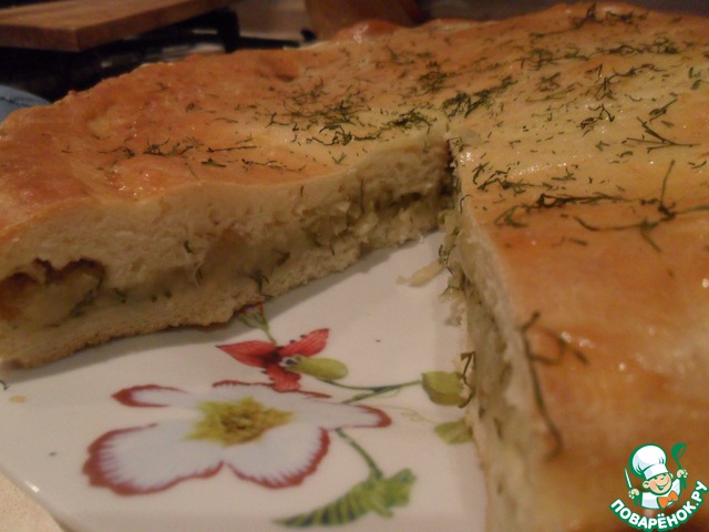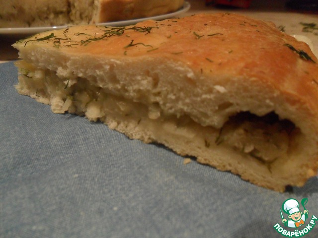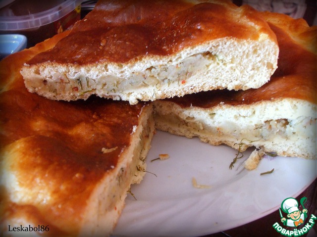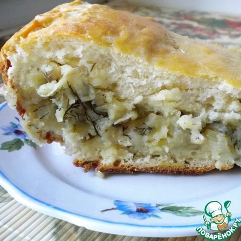 Отставить картофель слегка остыть. Разделить картофельное пюре на 2/3 и 1/3. Из большей части приготовьте начинку - смешайте картофель с зажаренным луком и измельченным укропом - эта начинка рассчитана на 2 пирога. -
