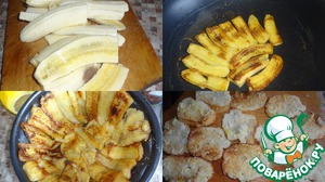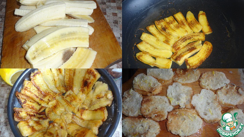 Бананы почистить, разрезать пополам поперёк а потом вдоль на 3-4 части (как получится). Разогреть на сковороде растительное масло и обжарить бананы с двух сторон по 2 мин.