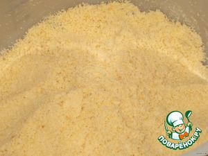 Миндаль с мукой и пекарским порошком перемолоть в комбайне или в блендере в муку.