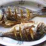 Лимон или лайм разрезать на две половины, одну половину нарезать. Рыбу несколько раз надрезать с одной стороны до хребта. В каждый надрез вложить по половинке лимона или лайма. Посыпать кориандром, смазать растительным маслом, сбрызнуть вином.