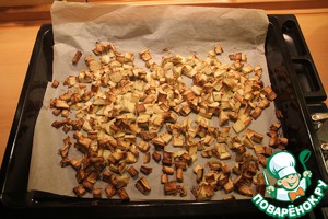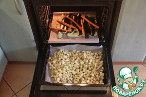 Нарезаем баклажан и морковь, отправляем в разогретую до 200 градусов духовку на 15 минут. -