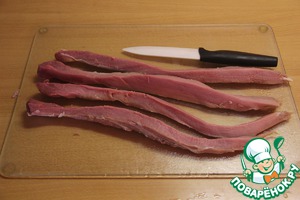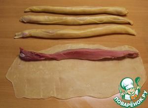 Раскатываем 4 части теста и заворачиваем в них 4 полоски свиного филе.