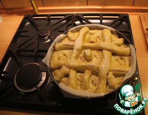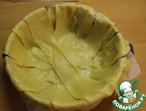 Потом укладываем полоски из теста так, чтобы немного свисали за края. -