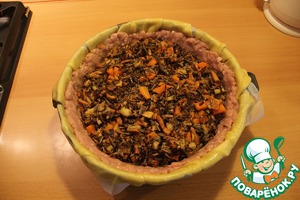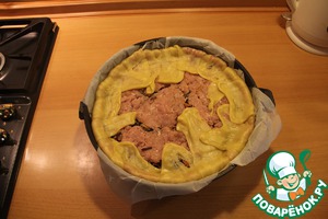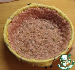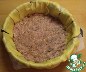 Оставшийся фарш укладываем сверху на начинке, не доходя до краёв.