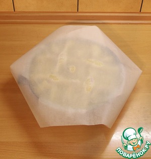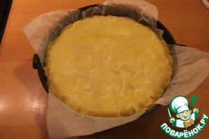Раскатываем кусок теста немного больше диаметра посуды и накрываем пирог, вминая края под стенку за пирог (между пирогом и бумагой)