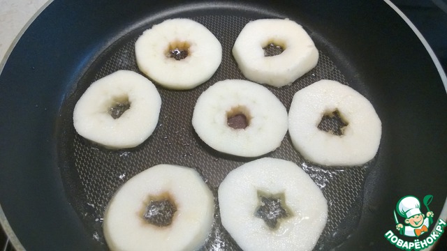 Яблоко почистить от кожуры и вынуть сердцевину. Порезать кружочками. Выложить наши подготовленные кружочки на заранее разогретую сковороду с добавлением масла. Обжаривать на большом огне с двух сторон. Рекомендация! Для декора лучше брать яблоки твердых сортов.