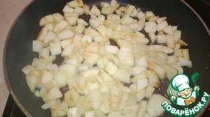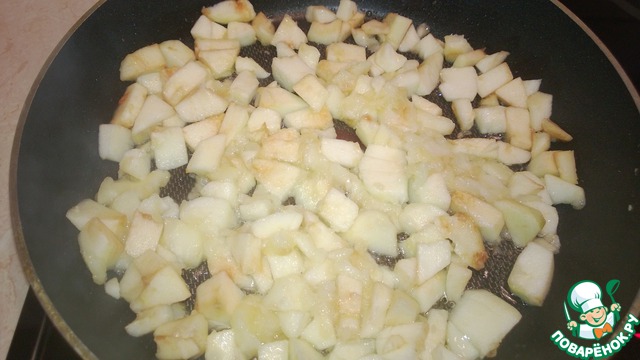 Второе яблоко режем на кубики и пассируем на сковороде 3 минуты.