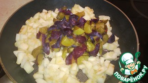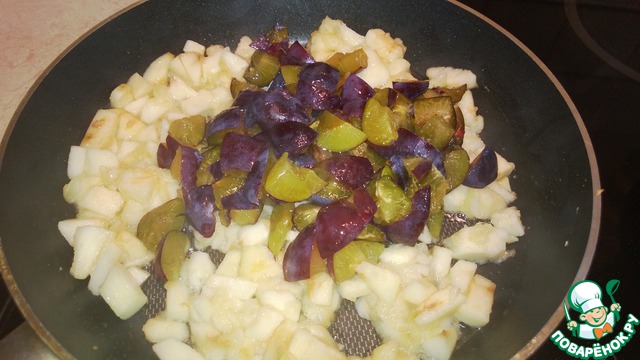 Добавляем нарезанные сливы, добавляем сахар и тушим до готовности. Приблизительно пять минут.