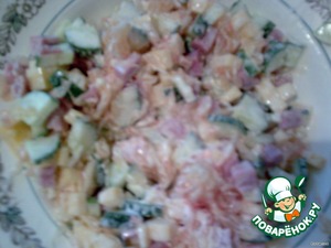 Все смешать, чуть-чуть подсолить (а можно и не солить), заправить майонезом.