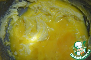 Сливочное масло комнатной температуры взбиваем с 0,5 стакана сахара. Добавляем 2 яйца. -