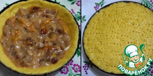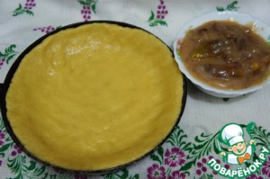 Равномерно распределяем начинку, а сверху аккуратно выложим круг из оставшейся половины теста, тщательно защипнув края пирога. Наколем верх пирога вилкой, отправляем пирог в разогретую до 180 градусов духовку на 30 минут, или до ярко-оранжевого цвета (в зависимости от вашей духовки).