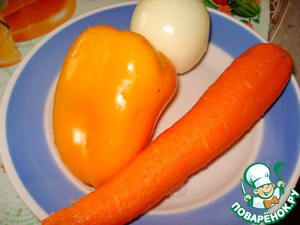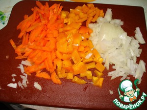В казане или сковороде разогреть растительное масло, добавить овощи. Обжаривайте, пока овощи не станут мягкими, в конце добавьте нарезанный мелко зубчик чеснока.