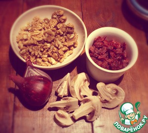 Смешаем грибы, лук, орехи, вяленную клюкву с диким рисом.
