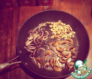 Свежие грецкие орехи разломать на кусочки, добавить к луку и шампиньонам.