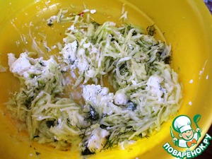 Натереть кабачок, слегка отжать, чтобы избавиться от лишнего сока. Смешать с фетаксой и взбитым яйцом. Добавить рубленую зелень и специи. Оставить немного яйца для смазки пирога.