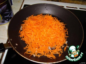 Морковку почистить и потереть на терке. Соединить с луком и поставить пассироваться.