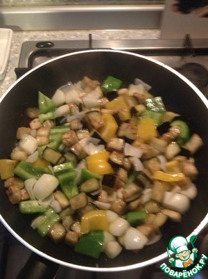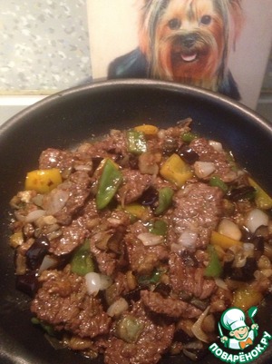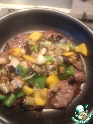 Потом овощи обжаренные добавляю к мяску и добавляю еще 2 ст. ложки соевого соуса,
