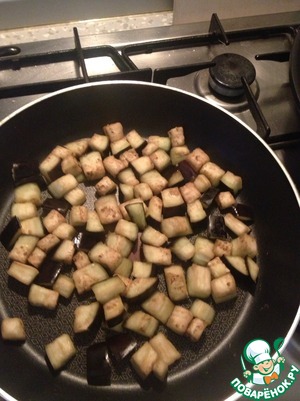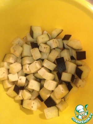 Баклажанчик моем, режем кубиками, шкурку не снимаем, засыпаем солью минут на 20, чтоб горечь убрать от шкурки