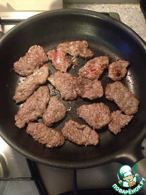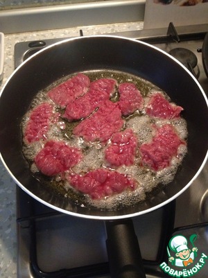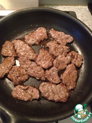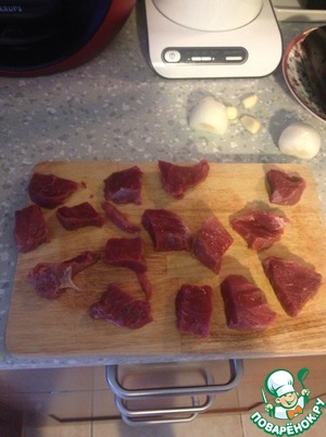 Говяжью вырезку - свежую, можно замороженную, нарезаем квадратиками, сверху можно накрыть бумажным полотенцем, чтобы водичка впиталась.
