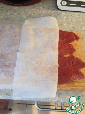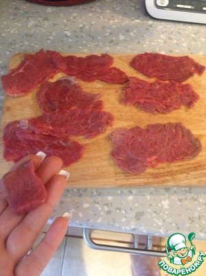Мяско отбиваем молотком, из таких кусочков получаются тонкие пласты; отбив, накрываем полотенцем бумажным, чтобы сок собрать