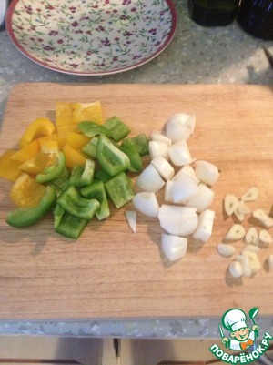 Режем остальное кубиками крупными - лук, чеснок, перец