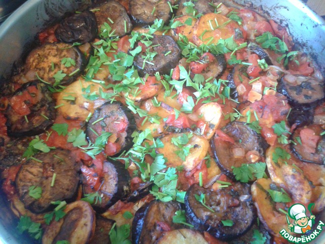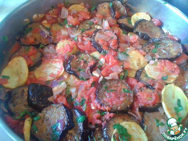 Баклажаны и картофель помещаем в противень с томатно-овощной смесью. Аккуратно перемешиваем. Ставим в духовку на 20-25 мин.