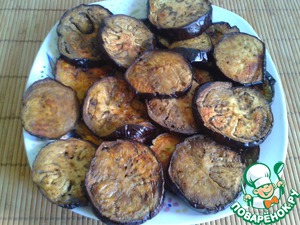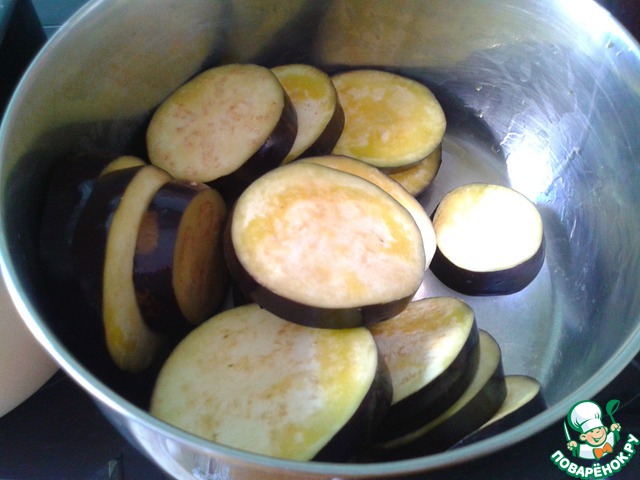 Баклажаны необходимо приготовить. В оригинальном рецепте они жарятся в большом количестве масла. Но это ооочень жирно!!! Я приготовлю баклажаны в специальной фритюрнице, без масла. Как вариант, могу предложить приготовить в духовке на противне, на непригорающей бумаге. Готовность будете определять по мягкости баклажанов. Во фритюрнице, так как баклажаны были в большом количестве, готовились 35 мин.