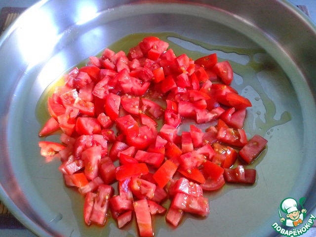 Этим временем готовим наш противень для заключительного этапа. Наливаем 5 ст. л. оливкового масла, режем помидоры средними кусочками и кладем в противень.
