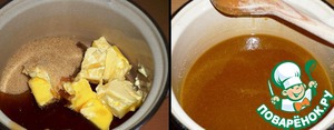 Масло, сахар, мёд и воду варить на маленьком огне до полного растворения сахара.