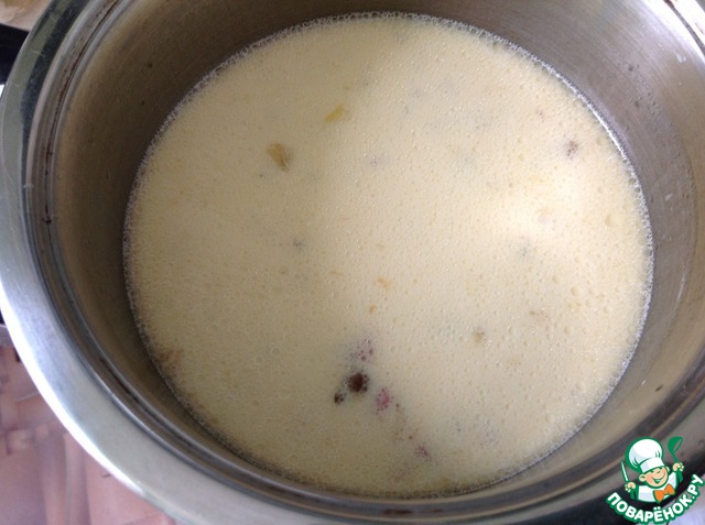 Сливки, яйца 3 шт., молоко - взбить и добавить нашу начинку