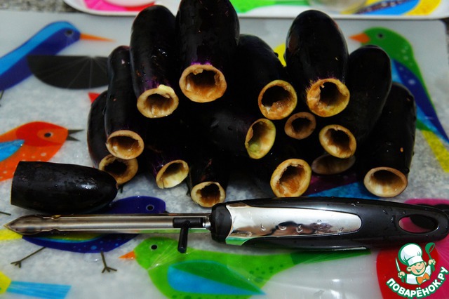 Отрезаем хвостики и специальным ножом достаем мякоть баклажана так, чтобы не повредить (не проколоть и не прорезать) сам овощ. Мякоть удаляется почти вся, остается только 2-4 мм мякоти. -