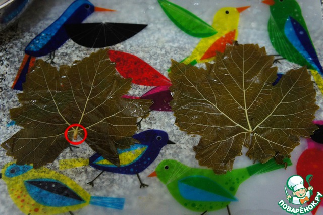 Так поступаем со всеми виноградными листьями, плотно выкладывая дно кастрюли по кругу. Малые листья можно соединять в один лист. Также место порыва листа можно накрывать маленькими листьями (или частями другого листа), чтобы максимально эффективно использовать все виноградные листья.