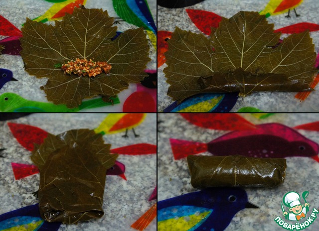 Начинаем фаршировать. Положите ближе к основанию листа немного начинки (1 ч. л.), чем тоньше вы ее распределите, тем тоньше получится рулетик. Заверните начинку основанием листа, потом боковыми частями по очереди и далее - плотно закатайте рулетик. Ориентируйтесь по фото. -